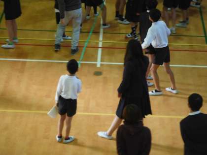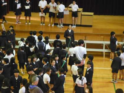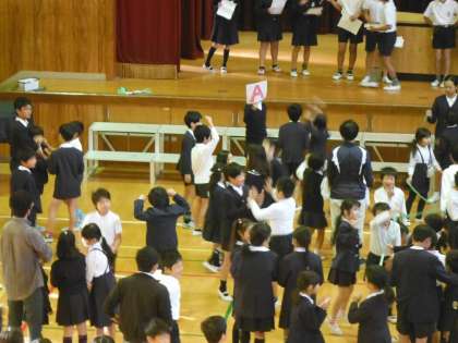 今朝〔11月7日(木)〕の児童集会は集会委員会の紹介でした。二択クイズの形式で集会委員会の委員長名や人数などが出題されました。子どもたちは一問一問、「A」か「B」に分かれながら、クイズに回答しました。