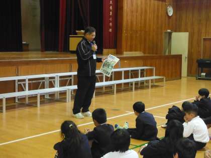 6年生代表のあいさつに合わせて、全員で朝の挨拶を行ったあと、校長先生からお話があり、続いて、当番の先生から今月の生活目標についてのお話がありました。