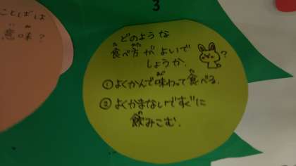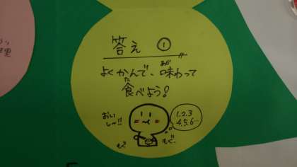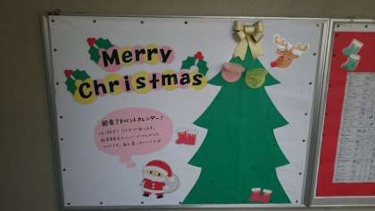 給食室前の掲示です。今年も「給食アドベントカレンダー!」が始まりました。一日、一問ずつ、給食委員会のメンバーが考えたクイズが貼られます。本日〔12月3日(火)〕のクイズは「どのような食べ方がよいでしょうか」です。答えはめくる(※下の写真)と出てきます。ぜひ、毎日、子どもたちとの話題にしてください。
