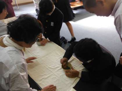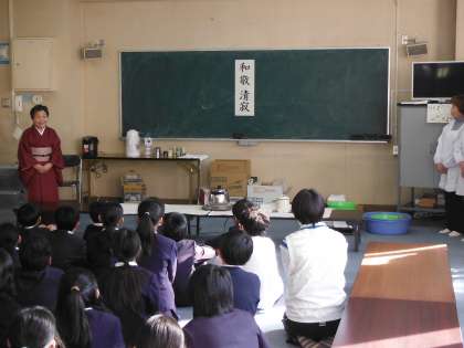 昨日〔12月9日(月)〕、5年生が茶道体験をしました。地域にお住まいの茶道の先生にお越しいただき、教えていただきました。お茶の心で「和敬静寂」という言葉を教えてもらいました。心和やかにして、他を敬い、静かな心で、動じることのない気持ちでお茶に向かうという茶道の心得を知りました。子どもたちは普段飲むことのない抹茶と和菓子を喜んで頂きました。抹茶が苦手な子どもは少ないようで、何杯もおかわりしている児童もいました。
