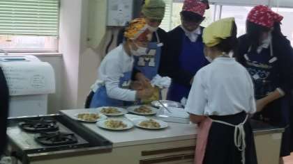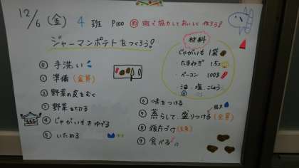 先週末〔12月6日(金)〕の午後、家庭科の調理実習で、6年生がジャーマンポテトを作りました。事前に手順と役割分担を模造紙にまとめ、壁に掲示をした上で、みんなで手際よく取り組みました。どの班もとてもおいしそうにできあがりました。
