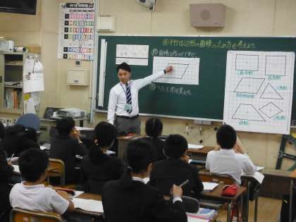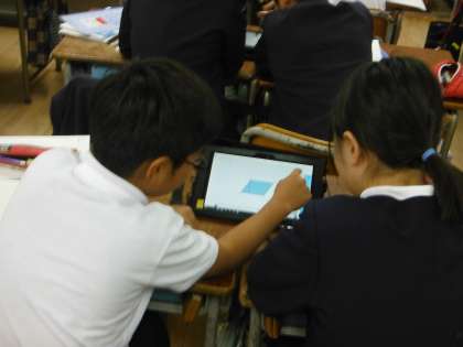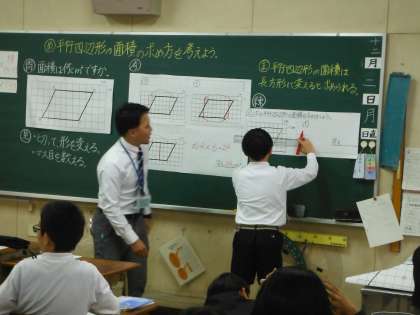 先週の月曜日〔12月2日(月)〕の5校時、算数の公開授業を行いました。今回の授業は西区算数主任会の公開授業も兼ねましたので、西区の各小学校から算数主任の先生方も参観されました。二人一組でタブレットを使いながら、平行四辺形を長方形に変形(一部を切り取って、他の場所に移す等)して平行四辺形の面積を求めました。子どもたちはいろいろな形の長方形に変形して、面積を求めました。