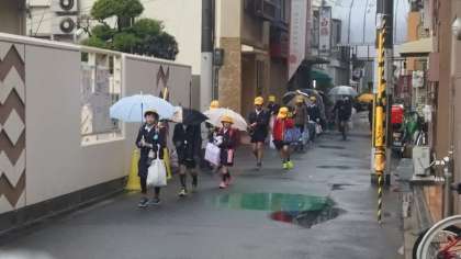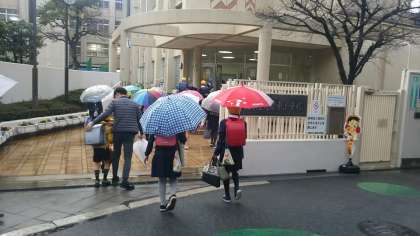 今朝の登校時の様子です。雨が時折、強く降りましたが、子どもたちは元気よく登校してくれました。現在、「強風注意報」等が発令されており、今後の天候情報に注意願います。