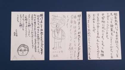 今年も6年生からたくさんの年賀状が校長先生宛に届きました。今年の一年間や3学期、4月からの中学校生活での目標や豊富など、どの年賀状も最高学年の6年生にふさわしい内容でした。健康に気を付けて、笑顔で充実した3学期を過ごしてほしいと思います。