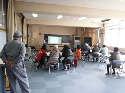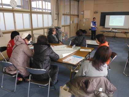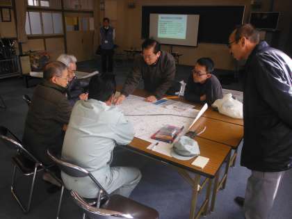 1月11日(土)の防災学習の2校時、地域と保護者のみなさんが多目的教室で「災害図上訓練」(Disaster Imagination Game)を行いました。危機管理室のアドバイザーに講師を務めていただきました。机上に住宅地図を広げて、グループ毎に具体的な避難経路等、いろいろな話し合いが行われました。