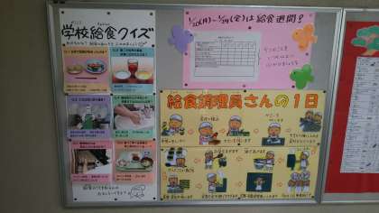 今月の給食室前の掲示です。学校での給食記念日、1月24日にちなんで給食がテーマです。「学校給食クイズ」や「給食調理員さんの一日」、今月の20日(月)から24日(金)の給食週間(給食がんばりカード)のお知らせが掲示されています。給食の知識(クイズ)について、ご家庭でも子どもたちに質問してみてください。