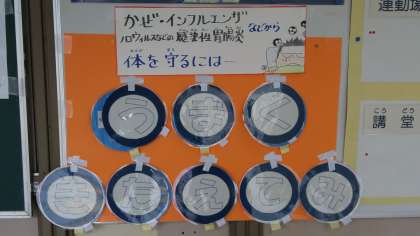 今朝は欠席や登校しているものの体調不良の児童が多く、校内放送で全体朝会を行いました。校長先生のお話の後、当番の先生から今月の生活目標のお話があり、保健室の先生からインフルエンザ等の感染症の予防についての注意喚起がありました。