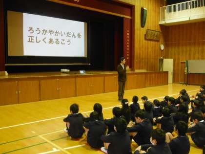 ・みんなが揃って、講堂で朝会を行うのは1月20日(月)以来です。体調がよくない人はいませんか。しんどい時はすぐに先生に言ってください。インフルエンザのA型は落ち着いてきましたが、近くの小学校ではB型にかかっている児童がいます。手洗い、咳エチケットをしっかりと行い、明日の祝日も休養をしっかりと取ってください。