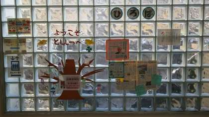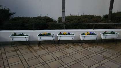 ※写真は左から玄関ホール・「ひろば」のコーナー、正門内のパンジーのプランターです。