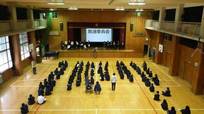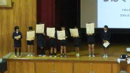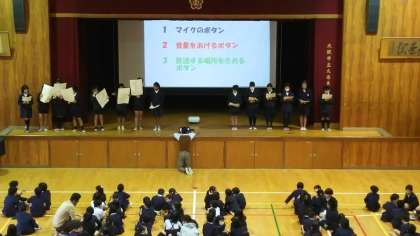 今朝の児童集会は放送委員会の発表でした。委員会の活動内容や放送時に委員全員が心がけていること等がクイズ形式で出題されました。