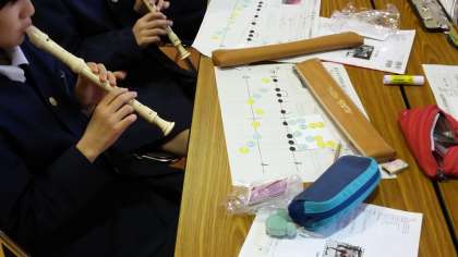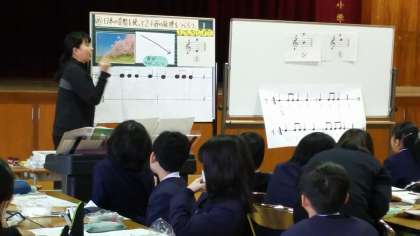 2月6日(木)、音楽の研究授業を行いました。さくらをイメージしながら、日本の音階(ミ・ファ・ラ・シ・ド・ミ)を使って2小節の旋律を作りました。ワークシートでポイントを確認しながら、各自でリコーダーを演奏して工夫をこらしました。