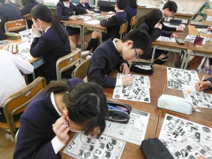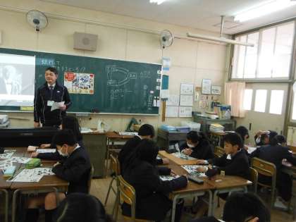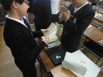 ※一番上の写真の黒板左端に投影している顔写真はみずほ銀行の前身の一つであり、日本最古の銀行である、第一国立銀行の設立・経営に携われた「渋沢栄一」の写真です。次の新しい一万円札のモデルです。一番下の写真では休憩時間に模擬紙幣を使って、お札の勘定を練習しています。