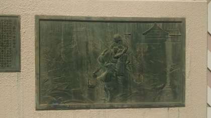 ※写真は上から「水害ハザードマップ」、正門横・中央大通り沿いの壁面にある「風水害記念碑」です。昭和9年の室戸台風の時の台風と高潮の恐ろしさと人々の協力を九条の人々が忘れぬように伝えています。復興後の昭和13年に本校の校舎は鉄筋コンクリートに建て替えられました。