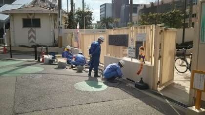 3月24日(火)、修了式を終えた子どもたちが下校した後、市岡工営所のみなさんに正門前の歩道の補修を行っていただきました。昨年度の7月に補修をしていただいた後も少しづつ段差が目立つようになっていました。放置自転車も含め、市岡工営所のみなさんには本校の周囲の環境整備にいつも迅速、かつ、丁寧に対応していただいています。引き続き、よろしくお願いします。
