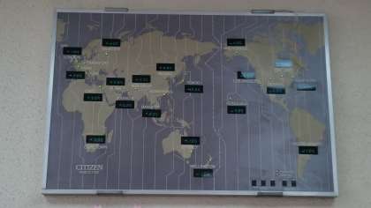 ※左の写真は今朝〔4月2日(木)〕の撮影です。右は玄関ホールに設置されている「世界時計」です。平成7年に校内に設置されました。