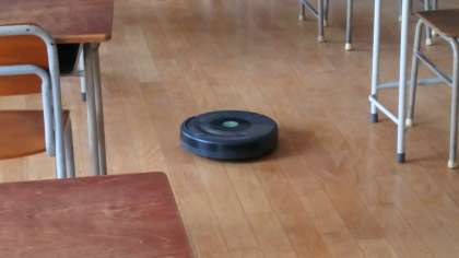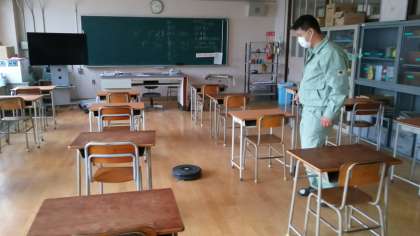 子どもたちが下校した後、教室やトイレ、廊下の手すり、水飲み場の蛇口等の手指がよく触れる場所を中心に教職員で手分けをして清掃・消毒を行っています。その中でお掃除ロボットの「くろくん」も頑張ってくれています。「くろくん」の今年の担当はなかよし学級の教室(月・水・金曜日)と音楽室(火曜日)、家庭科室(木曜日)です。管理作業員さんがいつもお世話してくれています。