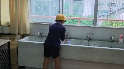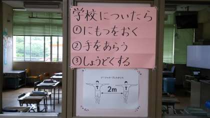 教室では担任の先生が健康観察表と健康状態を再確認した後、荷物を置いて、手を洗い、手を消毒してから席に着きます。下校の際にも手洗い・消毒を実施してから学校を出ています。