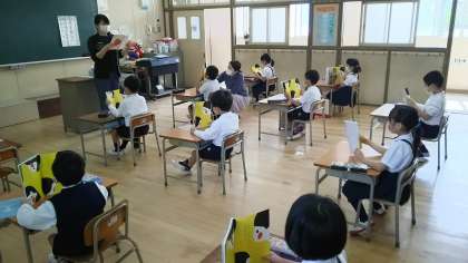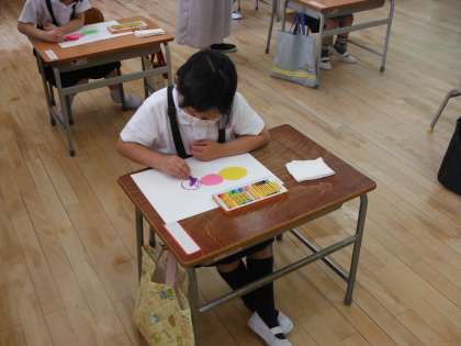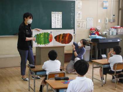 1時間目にみんなで教科書を使って音読をしました。「たん たん」と読みながら、手で机をたたいたり、足を踏みならし、音を合わせました。2時間目は「はらぺこ あおむし」の絵本を参考にクレパスを使ってあおむしの絵を書きました。