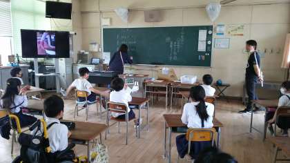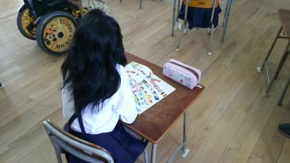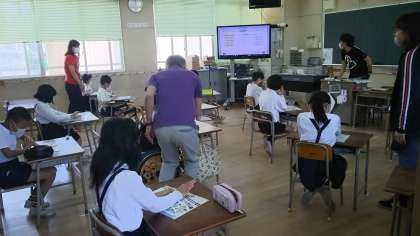 本日の学習風景です。外国語活動と音楽を行っています。音楽の授業では、リコーダーの指使いの練習をしました。本日の様に先生がお手本を示して、楽器を吹くことはありますが、当面の間、校内で子どもたちが歌唱や口に触れる楽器の演奏をすることは控えます。可能であれば、ご家庭で演奏をさせてあげてください。