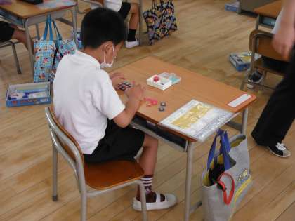 本日の授業風景です。朝の全員でのあいさつと2時間目のさんすうの様子です。朝は一人ひとり、健康状態(先生「○○さん、元気ですか?」)と下校の方法について先生と大きな声で話します。