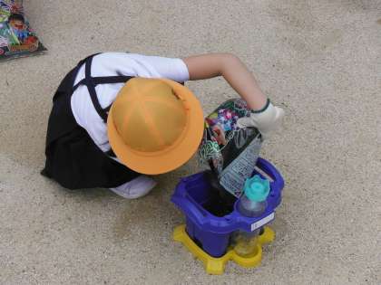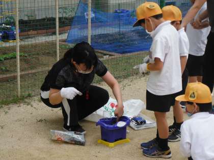 今日〔5月25日(月)〕、みんなであさがおを植えました。まず、教室で虫めがねを使って、たねの絵をプリントに描きました。それから、運動場へ出て、植木鉢に丁寧にたねを植えました。最初のみずやりを丁寧に行い、2年生のミニトマトの植木鉢の横にきれいに並べました。