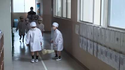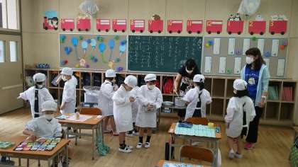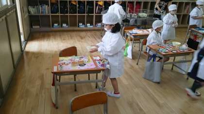 本日〔6月1日(月)〕の給食時間の様子です。例年であれば、6年生が準備を手伝うのですが、感染症予防のために今回は自分たちで協力して準備をしました。配膳の時もパン等の自分の係を担当しました。