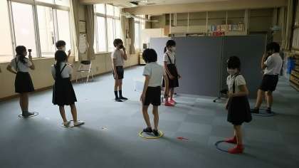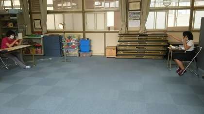 ※写真は昨日の4年生の写真です。多目的室で検査をしています。下の写真の様に、子どもたちは床面の輪の中に入り、友だちとの距離をとって、順番を待ちます。