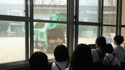 昨日〔6月11日(木)〕、西部環境事業センターの方々に来校いただき、講堂で環境学習「地球温暖化教室」を行っていただきました。前半は地球温暖化や海洋プラスチック、3R〔リデュース(「ほしい物を買う」から「必要な物を買う」へ、マイバック、食べ残さない等)、リユース(繰り返し使う、再利用)、リサイクル(再生利用)〕などをクイズなども交えながら、分かりやすく教えていただきました。西部環境事業センターの皆さんが着ていた服もリサイクル品だそうです。後半はパッカー車を実際に動かしていただき、車の仕組みやお仕事の内容等を詳しく教えていただきました。今回が出前授業再開の初日だったそうです。雨の中、本当にありがとうございました。