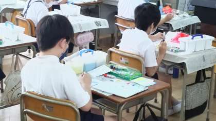 5年生は図工の時間でした。絵の具を使って一生懸命、絵を描きました。何の絵を描いたのか、子どもたちに質問してください。