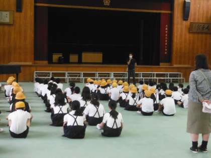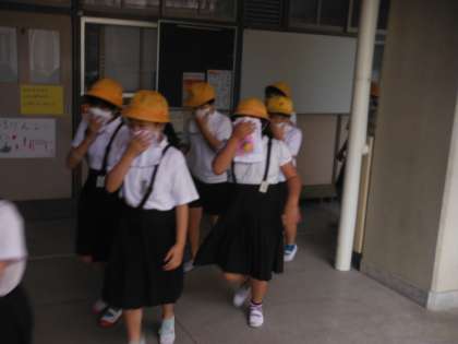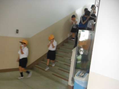 本日〔6月18日(木)〕の午前中、理科室からの出火を想定した避難訓練を行いました。先生の指示に従って、子どもたちは真剣に行動し、緊急放送開始から点呼終了までの所要時間では昨年比で4秒短縮することができました。校長先生は「全ての訓練は真剣に取り組むこと」と「ハンカチは常に持っておくこと(火災の死亡原因の9割以上が窒息です)」等を話され、生活指導の先生からは訓練全般のお話しと訓練とは別に登校時間の注意(8時25分までに登校することと早すぎるのも危険。集団登校の時間に合わせること)をされました。