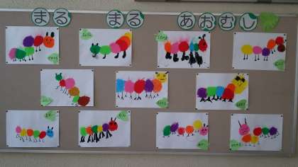 ※写真は玄関ホールに掲示してある、1年生が描いた「まるまるあおむし」です。来校時にご覧ください。