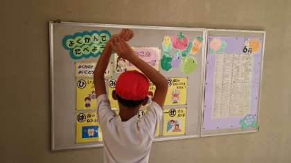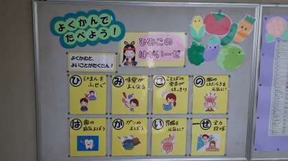 給食室前の掲示です。よく噛むと良いことがたくさんあります。「ひみこの はがいーぜ」としてまとめてあります。ご家庭でもこどもたちに指導願います。