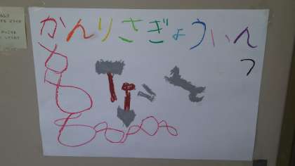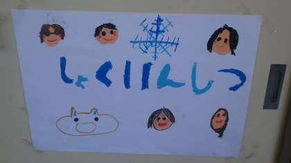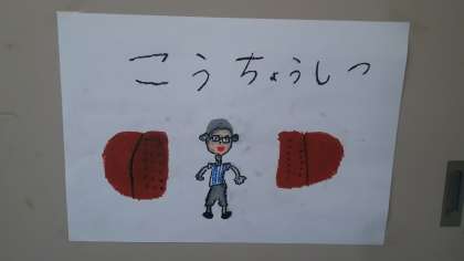 先日、2年生が1年生を案内して校内を探検した時に、各教室を紹介した絵です。教室の入口の扉に貼ってあります。一年間、掲示しますので、来校時にご覧ください。写真は上から管理作業員室、職員室、校長室です。