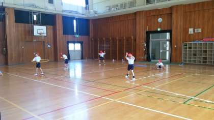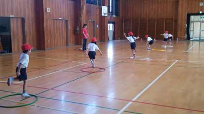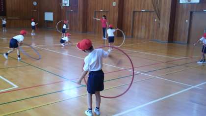本日の3校時、1年生は講堂で体育でした。距離をとって、フープを使いました。片足で跳んで、フープをまたいだり、腰や腕で回したり、色々な運動をしました。