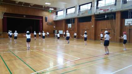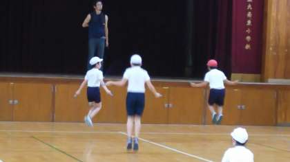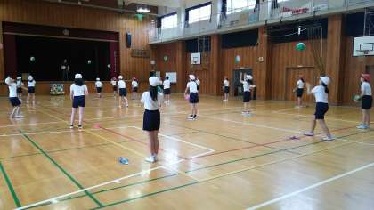 本日の4校時、雨のため、講堂で体育の授業を行いました。距離をとって、なわとびとボールを使いました。各学年がなわとびを行っていますが、二重飛びを続けて何回飛べるか等、高学年らしい内容でした。ボールも一人一個で色々な運動を行いました。