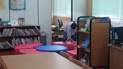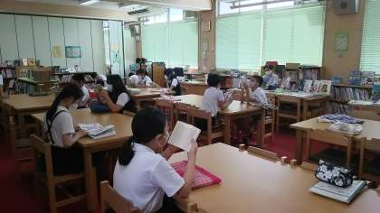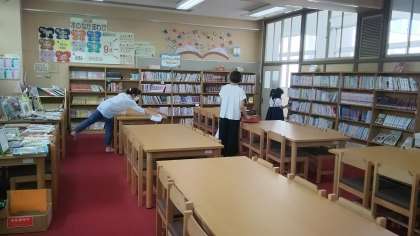 毎週木曜日は学校図書館支援員の先生に勤務いただいています。木曜日の国語の授業は全学年が図書室も活用して行っています。授業後には学校図書館支援員の先生が消毒作業を行います。上と中央の写真は昨日〔7月2日(木)〕の5校時、2年生の時間が終了した後の撮影です。木曜日以外の昼休み等の図書室開放時にも担当の先生が消毒作業を行っています。(下の写真は昨日の6校時の6年2組です。)