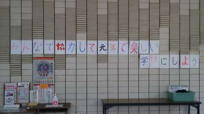 昨日の児童集会での発表後、玄関ホールに全校の今年の目標が掲示されました。力を合わせて、一年間、がんばってほしいと思います。