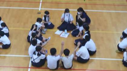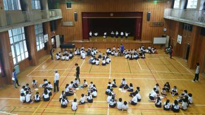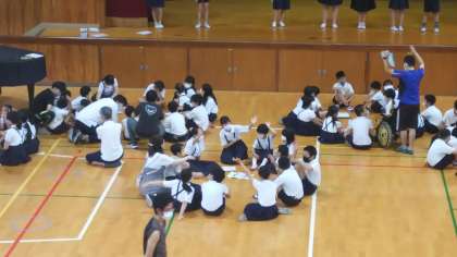 本日から児童集会は「たてわり班」(異学年で構成する班)での活動に入ります。今日は「一人で考えるゲーム(二択クイズ)」を行いました。いつもは1年生から6年生までのみんなで、わいわいがやがや、相談して答えを決めるのですが、一人で考えて合図〔回答Aはわかめのポーズ、回答Bはカニのポーズ〕をして班の答えを決めました。質問内容は、校内の鉄棒や桜の木の数や男子と女子のどちらが多いか、給食の献立等、みんなの身近な問題でした。集会委員会が色々と工夫してくれました。短時間でみんなで盛り上がることができました。