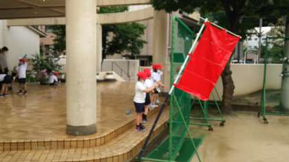 雨の日に運動場の使用禁止を知らせる「赤旗」が新しくなりました。この旗が下げられるまで運動場が使えなくなります。先日、鬼ごっこをしている様子をお知らせしましたので、次はボール遊びの様子をお知らせする予定なのですが、今年は激しい雨が降ることも多く、なかなか外で遊べません。