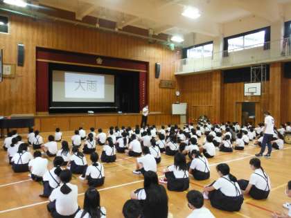 ・大雨が続いています。熊本県を中心に70名もの方がお亡くなりになっています。明日にかけて大阪も大雨になるそうです。みんなが住んでいる九条の町には近くに山はありませんので、土砂崩れの心配はありませんが、川には注意しましょう。危ないので、近づいてはいけません。85年前の室戸台風の記念碑や動物ものさし(本校は「キリン」)のことも忘れてはいけません。