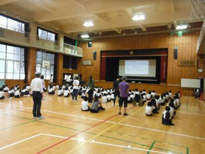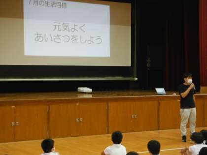 6年生代表のあいさつに合わせて、全員で朝の挨拶を行ったあと、校長先生からお話があり、続いて、当番の先生からは7月の生活目標(やさしく、相手の目を見て、届く声であいさつしよう)、保健室の先生からは今日から始まる「けんこう週間」・「がんばりカード」のお話がありました。