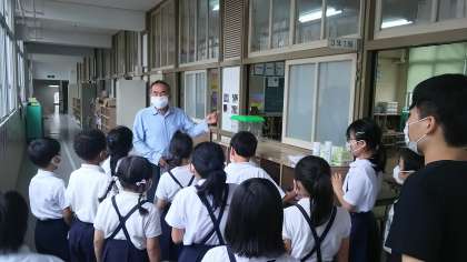 一昨日〔7月13日(月)〕、アゲハチョウのサナギをいただいた、アドプトリバー千代崎を運営されている地域の方に来校いただき、アゲハチョウのお話をしていただきました。朝に羽化した成虫を見ていただくとともに、今回は幼虫を3匹、プレゼントしていただきました。