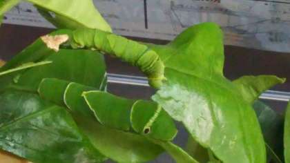 ※卵から生まれて、5回程度脱皮をします。1〜4齢幼虫は中央の写真の様な姿です。5齢幼虫になると下の写真の様に緑色になります。大きい方は近々、サナギになる見込みです。小さい方は、もしゃもしゃ、一生懸命にミカンの葉っぱを食べているところです。