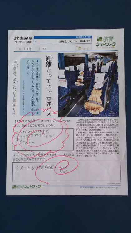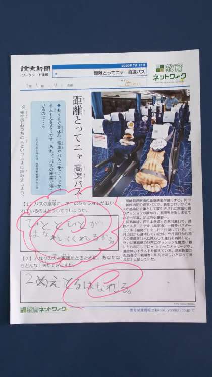 先週、1年生が初めて、こども新聞の「ワークシート通信」に取り組みました。ひらがなを習い、本日〔7月20日(月)〕、カタカナの勉強が始まったところです。「2めえとる はなれる」等、みんなが一生懸命、答えてくれたのがとてもよく伝わってきました。