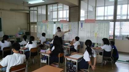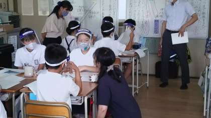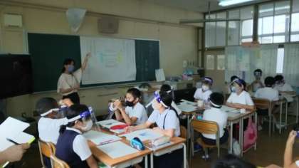 昨日〔7月21日(火)〕の5校時、6年2組で国語の研究授業を行いました。西区の国語科主任の研究授業も兼ねて行われましたので、たくさんの先生が見学しました。教材は「風切るつばさ」。文章を読んで、描写を基に二匹のアネハヅルの心情を考えました。人物関係図を使いながら、まとめていきます。これまでの授業でまとめた三つの場面の人物関係図を廊下側に側面掲示し、これまでの物語の復習を行った後に授業が始まりました。授業の終盤、フェイスシールドをつけて、グループで話し合いをしながら、ツルたちの心情をより深く理解しました。