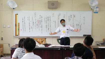 今年度から2年間、本校の研究教科は(※)「国語」です。学力向上推進指導室の先生(本市小学校教育研究会国語部の部長経験者)にも2年間、毎月ご指導いただきます。研究授業を行った後、本校の先生を2班に分け、グループで授業内容を協議・発表し、その後、指導室の先生から指導講評をいただきます。討議会後も指導室の先生を囲んで色々とご指導いただきました。また、効果検証授業を行った5年生の先生も校長室で個別に丁寧なご指導をいただきました。