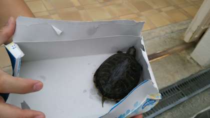 亀たちが校庭の池から出て歩き回っています。校内で発見されるのがほとんどなのですが、先週、卒業生の保護者の方が連れてきてくれました。ご自宅の玄関先に居たそうです。梅雨の影響で運動場の池の水位が上がるのが原因の一つだと思われます。見かけたら、ご連絡願います。
