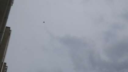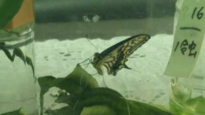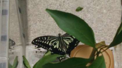 連休中、スポーツの日の7月24日(金)の朝にサナギだった「スノー」がチョウチョウになっていました。子どもたちが登校する月曜日まで丸三日間もあるために、校長先生は担任の先生と相談をして自然に帰してあげることにしました。学習園で放しましたが、「スノー」はきれいな羽を広げて真上に上がり、自分が幼虫の時から育った3年生の教室の窓の辺り(下の写真。左上の黒い点が羽ばたいている「スノー」)で何度も輪を描いてから元気に飛び去りました。