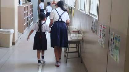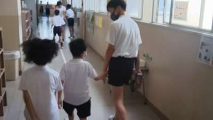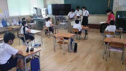 昨日〔7月29日(水)〕の6校時、全児童が登校班に分かれて、二回目の地域子ども会を行いました。まず、6年生が1年生を教室まで迎えに来ます。各教室では正しい通学路や歩き方の確認や夏季休業中の安全な生活について話し合いました。