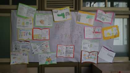4年生が1年生と2年生に「おすすめの本」をまとめてくれました。2階の1年生と2年生の教室の間にある生活科室の廊下側の壁に貼ってくれています。どの一冊もきれいな絵とすすめる理由がとても上手にまとめてあります。おすすめの本はすぐに手に取れる様に、全冊揃えて、ポスターの下(中央の写真)に置いてくれています。